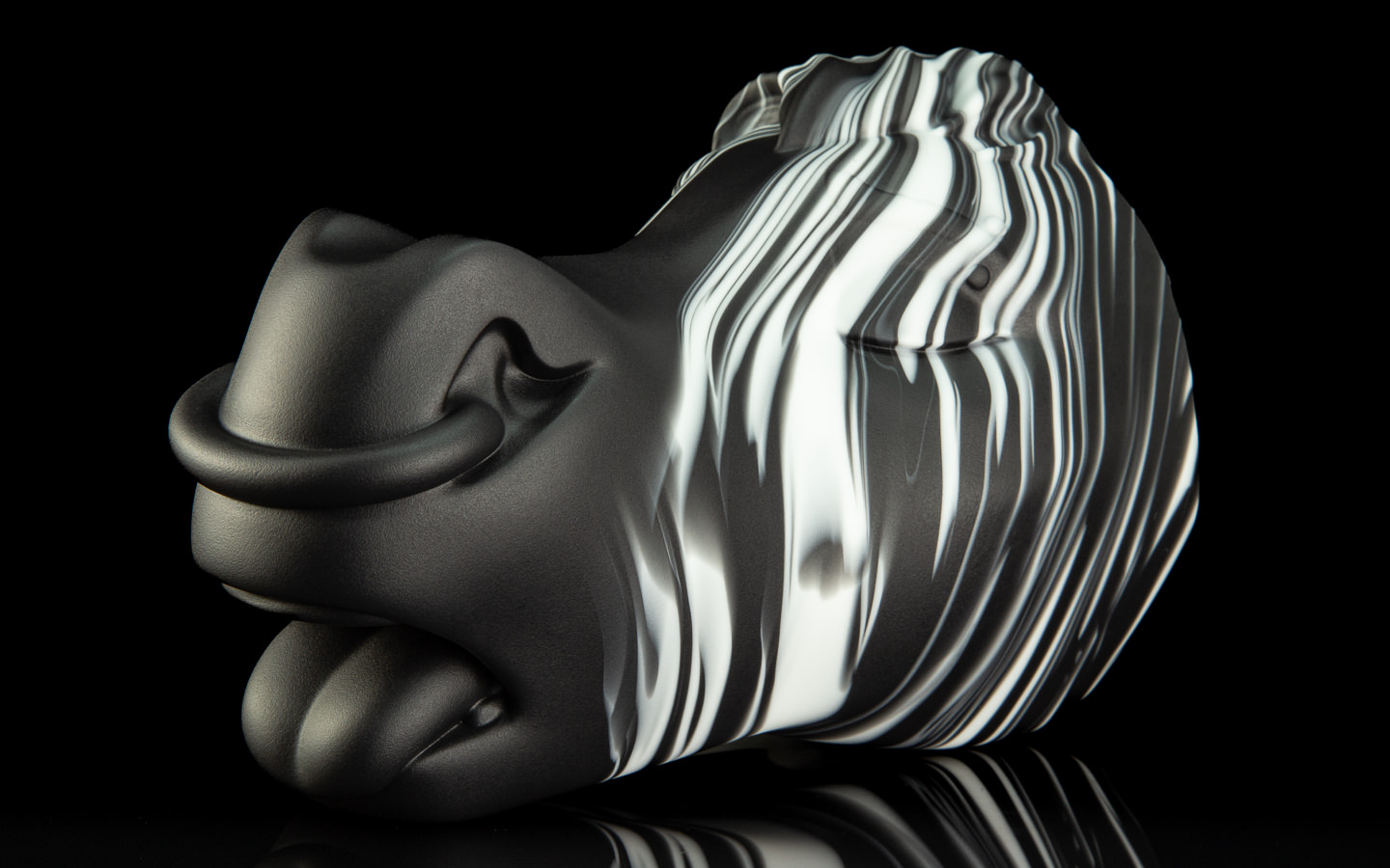 A cute unicorn colouration; His face is swirled between a sparkling white, purple and sky blue before smoothly transitioning to a pink muzzle.