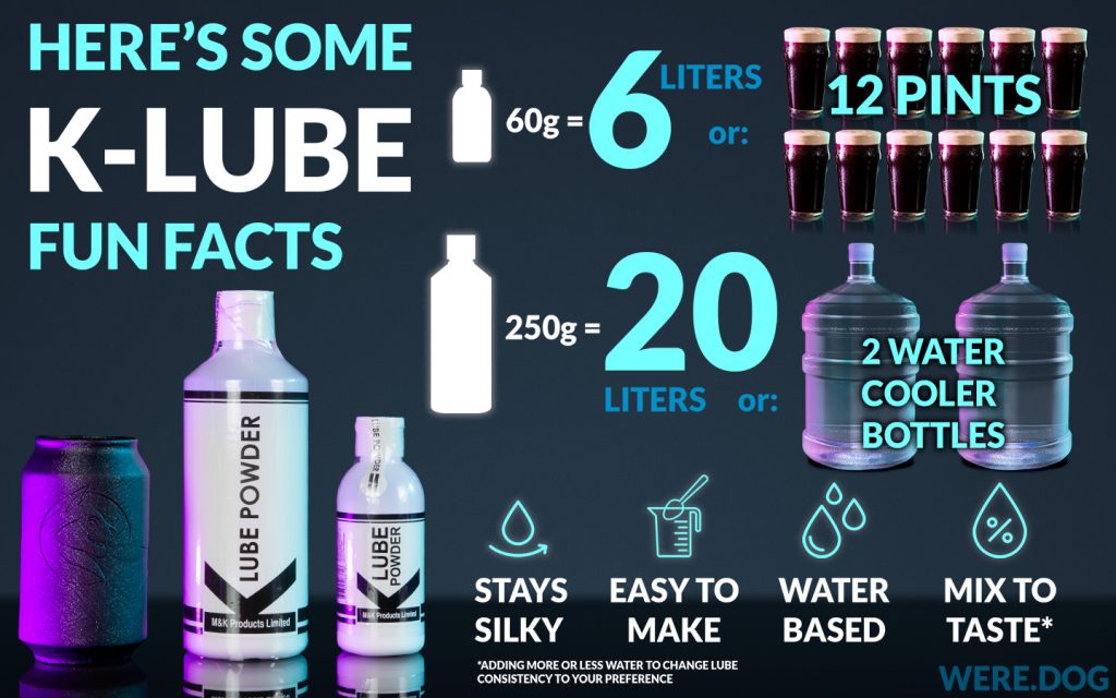 We’ve been waiting for a while to add a lube to our lineup, because we want to sell you guys the right stuff for our toys. And this – in our opinion – is the right stuff. K-Lube comes in a powdered form which you dilute in water at home; a very small amount of powder will make dozens of bottles of lube, depending on how thick you like it!