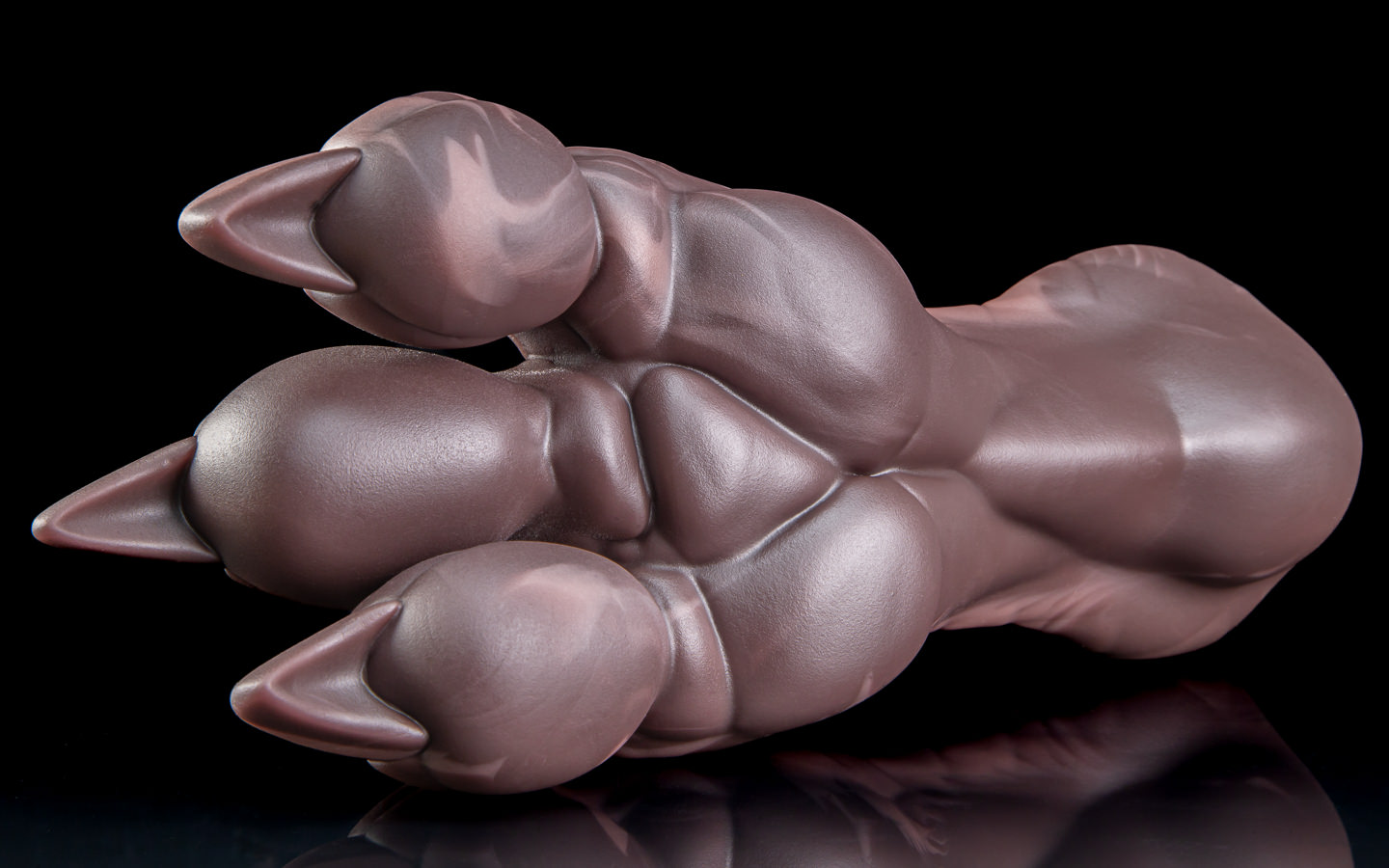 In the final product, we think we got pretty close to the real thing! His toes compress and deform to the touch in a lovely way, the body/ball of the foot has a sturdy firmness to it, and the scale and tendon details strewn up and down him make for a luxurious feel. If he were a human, he'd be about a 13 shoe size - in their resting position, the toes and pads are wide enough to completely cover your eyes. It really is the closest you can get to a dragon’s hindpaws.
