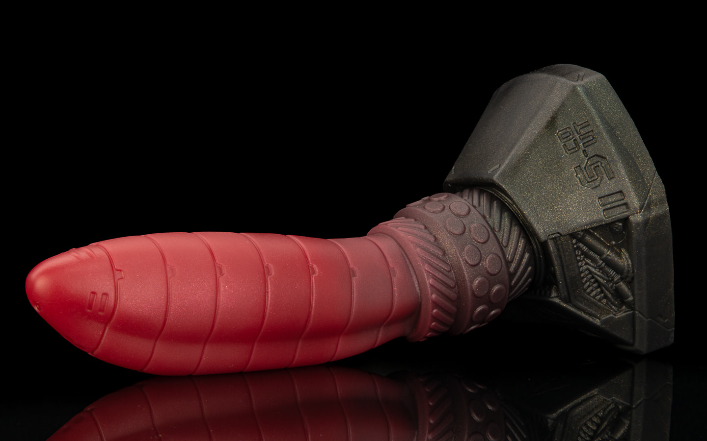 The base is a dark steel and red swirl.