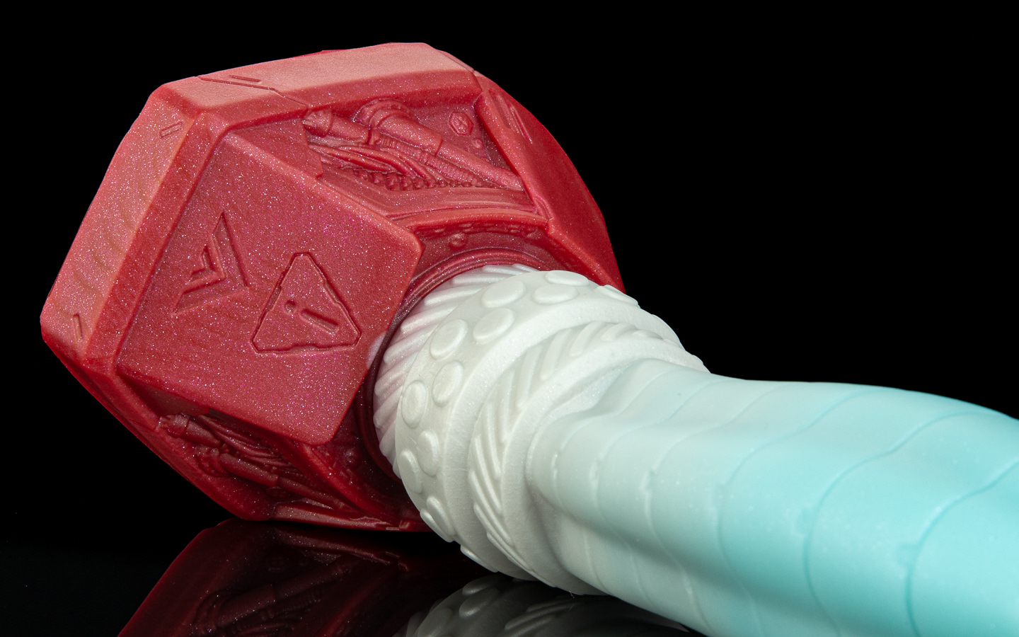 The base is a dark steel and red swirl.