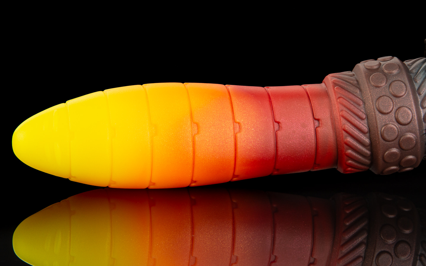 The base is a dark steel and red swirl.