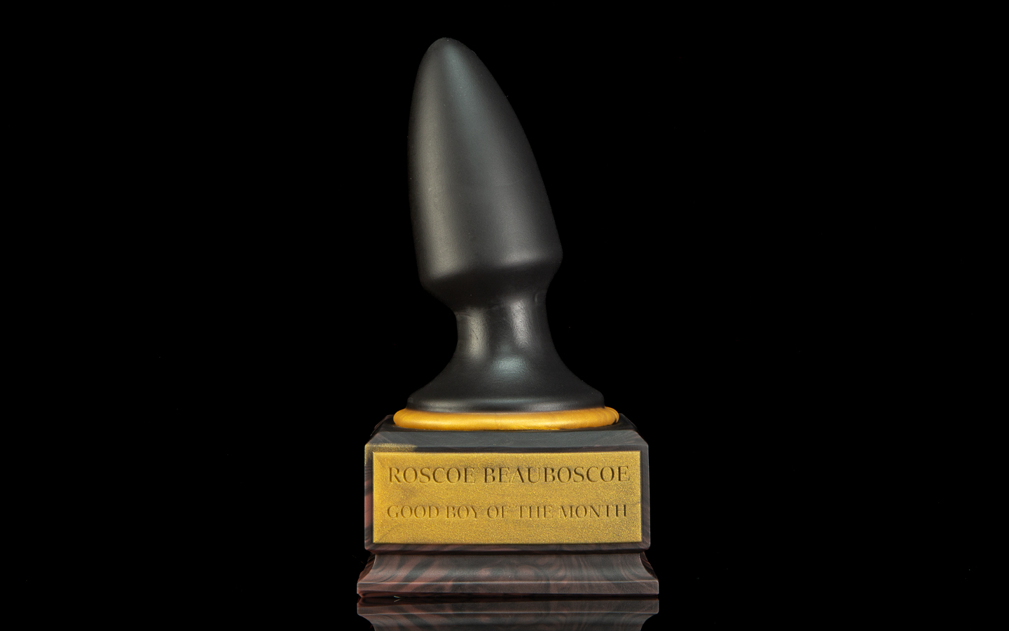 We wanted this toy to be as accurate as possible, so our production staff have gone above and beyond; the “plug”, plaque and gold ring are all poured separately from black and gold silicone, then the base is poured using a black and brown swirl to emulate wood texture. In person, it hardly even looks like its entirely silicone until you pick it up.