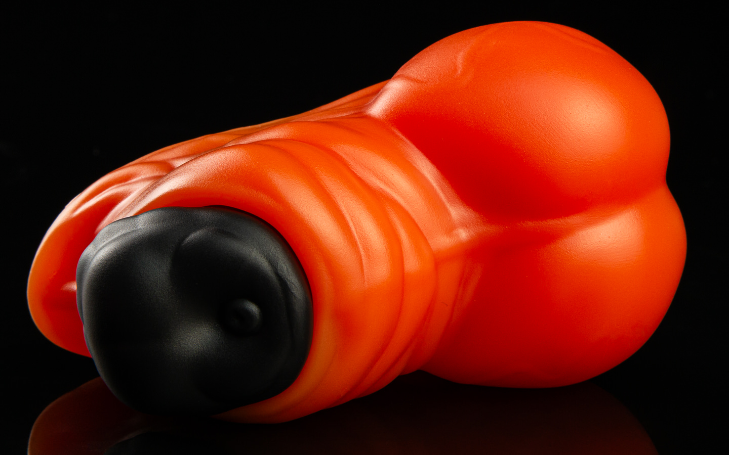 A: Both the core and the sheath itself are made from the same silicone as our penetrables – very soft, very pliable. Silicone can tear no matter what shape it’s in, so be careful with the more delicate parts of the sheath, especially around its opening! Don’t bite or overstretch it, and keep sharp/pointed objects away.